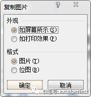 接著,excel會彈出以下小視窗。選擇外觀為“如屏幕所示”,格式設定為“圖片”,接著按“確定”。