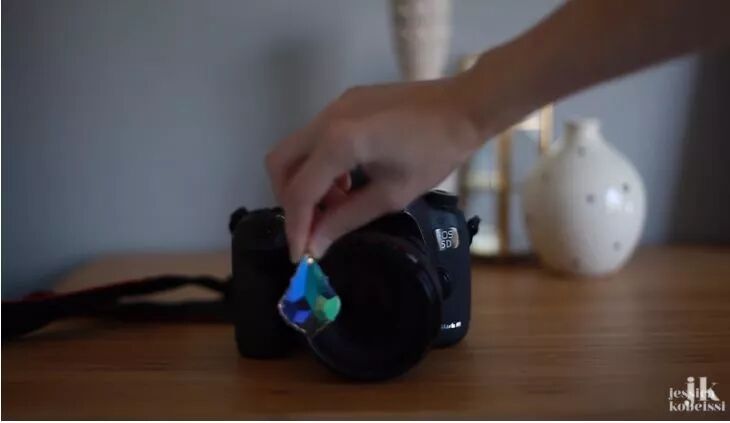 如果你嫌普通的稜鏡或玻璃磚造成的效果太過平凡,你可以找來一些類似鑽石切割的假寶石晶體吊墜,放在鏡頭與模特兒之間,為畫面帶來較豐富的的反射光,也是一種獨特效果。