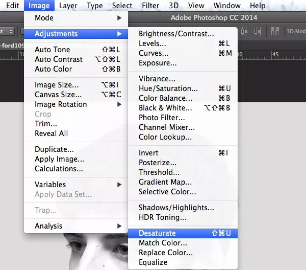 把人物去色以符合森林照片的色調。保持選擇人像層,執行圖像>調整>去色