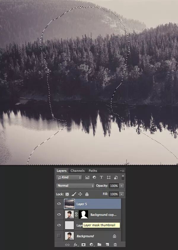 點擊森林圖層與圖層遮色片之間的鏈圖標,使他們解鎖,然後把森林的照片顛倒,這樣的樹木被放置在頭部區域的輪廓,如下面的截圖顯示。
