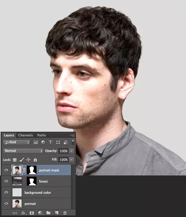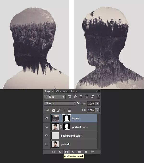 選擇包含剪貼遮色片的人像層。製作一個副本(control-j)和拖放到森林層之上。