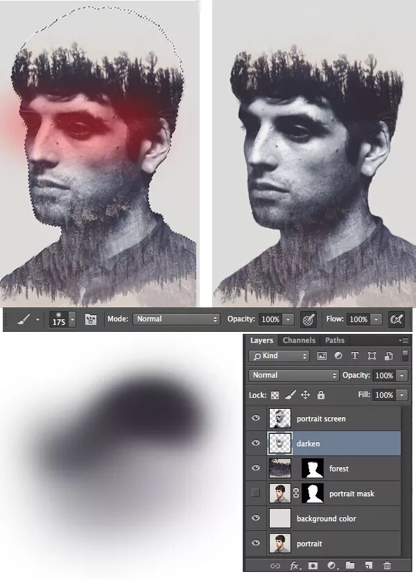 選擇森林圖層的圖層遮色片,將前景色填充顏色設置為白色,然後用小號的軟畫筆輕輕地在頭部區域的上部(用紅色標記)塗抹,從而消除頭部不想要的部分。使圖像看起來像樹木直接從男人的頭生長出來。