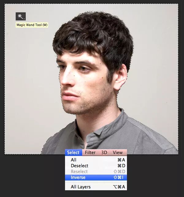 現在我們需要把人物摳出來。使用魔法棒工具,然後點擊背景任一點來選擇它。接著在右鍵選單中點擊 選擇>反向,選取人物。