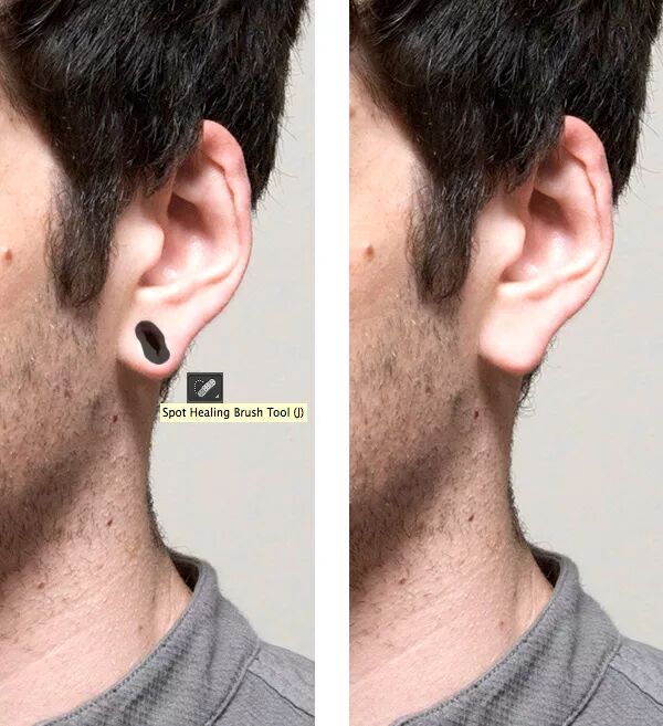 現在我們用污點修復畫筆或修復畫筆工具來處理這個人的耳朵。