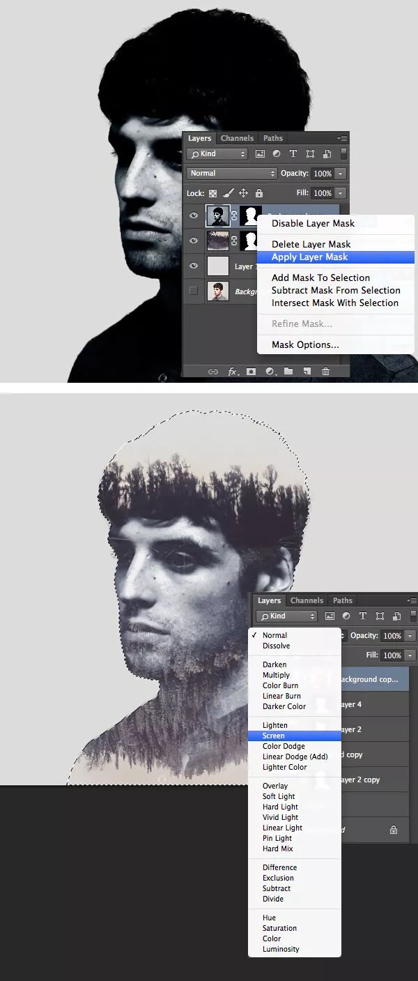 選中人物圖層的圖層遮色片點擊右鍵,選擇應用圖層矇蔽。再改變圖層的混合模式為濾色。我們已經可以看到所需的雙重曝光效果出現!接下來只有一些小的調整了,讓我們繼續吧!