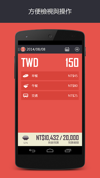 簡單明瞭的介面讓記帳也可以很輕鬆!隨時顯示當月還有多少餘額